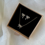 Boksen består af vores populære sløjfe øreringe og sløjfe petite halskæde.