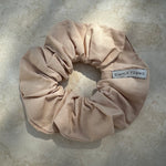 En stilfuld scrunchie hårelastik i beige bomuld, der tilføjer et klassisk finish til dit look.
