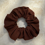 En stilfuld scrunchie hårelastik i brun hør, der tilføjer et klassisk finish til dit look.