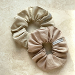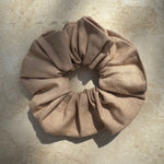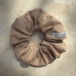 En stilfuld scrunchie hårelastik i camel beige hør, der tilføjer et klassisk finish til dit look.
