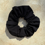 En stilfuld scrunchie hårelastik i sort bomuld, der tilføjer et klassisk finish til dit look.